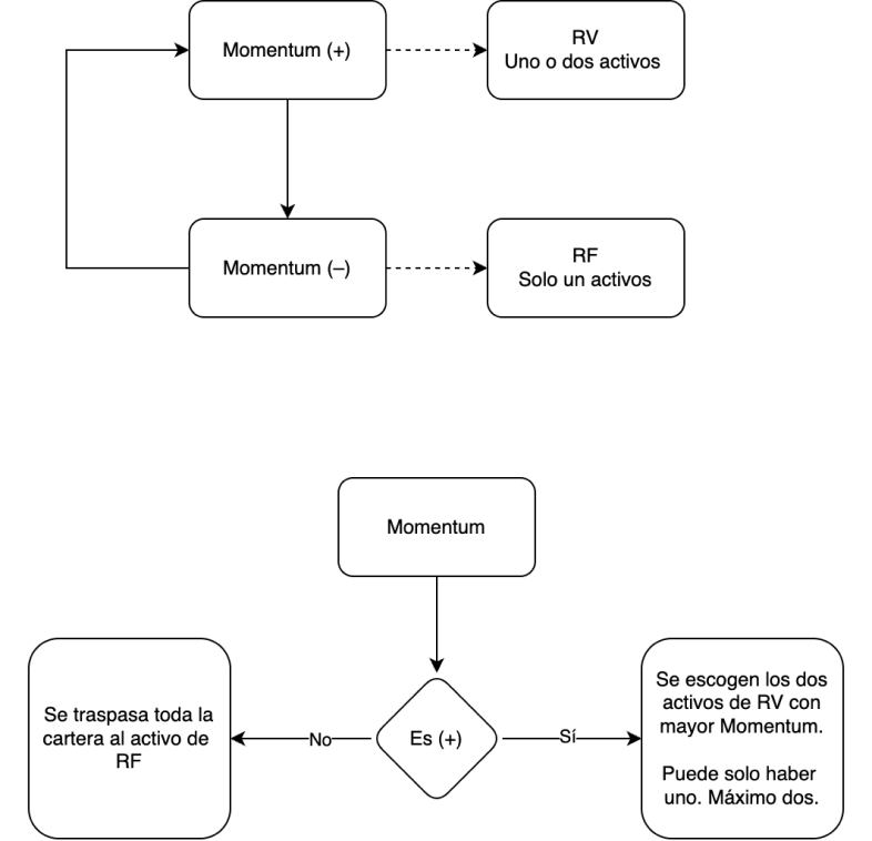 Cuando el último día del mes en curso, el momentum sea negativo para todos los índices de RV. Es entonces cuando escogemos el indice de RF.